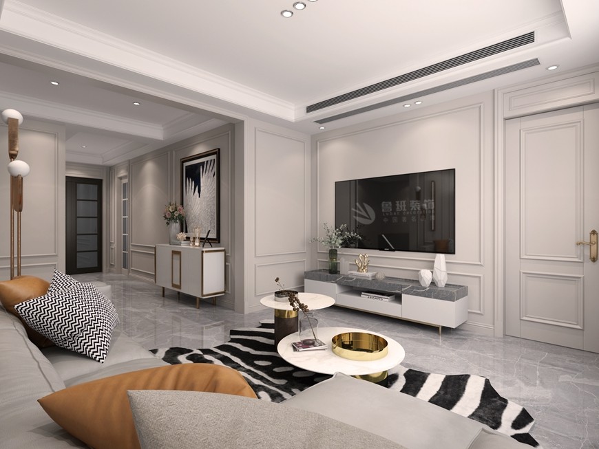 ▲西安(ān)魯班裝(zhuāng)飾南湖(hú)藝境260平米複式美式輕奢浪漫設計——客廳電(diàn)視背景牆設計
